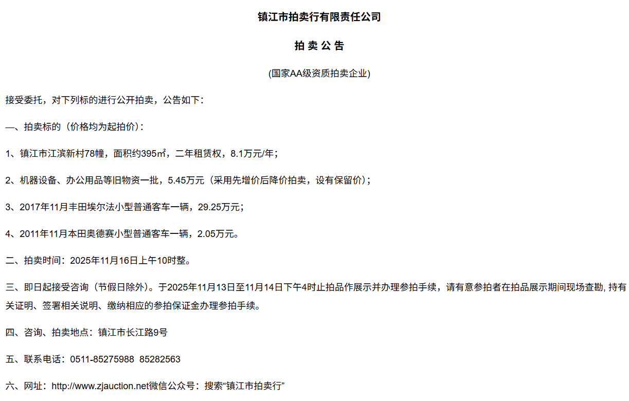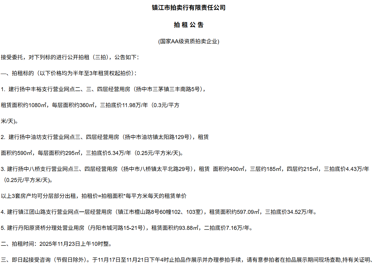 鎮江市拍賣行有限責任公司拍 租 公 吿(國家AA級資質拍賣企業)接受委托,對下列標的進行公開拍租(三拍),公告如下:—、拍租標的(以下價格均為半年至3年租賃權起拍價):1.  建行揚中豐裕支行營業網點二、三、四層經營用房(揚中市三茅鎮三豐南路5號),租賃面積約1080㎡,每層面積約360㎡,三拍底價11.98萬/年(0.3元/平方米/天)。2.  建行揚中油坊支行營業網點三、四層經營用房(揚中市油坊鎮太陽路129號),租賃面積約590㎡,每層面積約295㎡,三拍底價5.34萬/年(0.25元/平方米/天)。3. 建行揚中八橋支行營業網點三、四層經營用房(揚中市八橋鎮太平北路29號),租賃  面積約400㎡,三層約185㎡,四層約215㎡,三拍底價4.43萬/年(0.25元/平方米/天)。以上3套房產均可分層部分出租,拍租價=拍租面積*每平方米每天的租賃單價4. 建行鎮江團山路支行營業網點一層經營用房(鎮江市檀山路8號60幢102、103室),租賃面積約597.09㎡,三拍底價34.52萬/年。5. 建行丹陽原賢橋分理處營業用房(丹陽市城河路15-21號),租賃面積約93.88㎡,二拍底價7.16萬/年。二、拍租時間:2025年11月23日上午10時整。三、即日起接受咨詢(節假日除外)。于11月17日至11月21日下午4時止拍品作展示并辦理參拍手續,請有意參拍者在拍品展示期間現場查勘,持有關證明、簽署相關說明、繳納相應的參拍保證金辦理參拍手續。四、咨詢、拍租地點:鎮江市長江路9號五、聯系方式:0511-85275988   13655299933楊先生六、網址:http://www_zjauction_net.bjhmysf.cn;微信公眾號:搜索“鎮江市拍賣行” 拍品清單2025.11.23序號名稱起拍價(元)標的說明1建行揚中豐裕支行營業網點二、三、四層經營用房(揚中市三茅鎮三豐南路5號),租賃面積約1080㎡,每層面積約360㎡三拍底價11.98萬/年(0.3元/平方米/天)1、1-3號房產均可分層部分出租,拍租價=拍租面積*每平方米每天的租賃單價;2、意向競拍人在拍賣前需持營業執照或身份證與委托方說明租賃房產經營業態,確定意向后出具房產承租用途承諾書,經委托方審核后,方可交納保證金參加競拍;3、租賃期限為半年至3年(承租方與出租方協商而定),承租方每半年或一年結付租金,租賃期間的水、電費用及其它相關費用均由承租方承擔;4、承租方不得用于經營和保管危險物品,不得用于開設餐飲、娛樂等可能嚴重影響消防安全、運營安全的經營業態,不得用于經營委托貸款、小額貸款等可能冒用委托方名義,帶來聲譽風險的經營業態。租賃期內,承租方不得破壞墻體結構,自行成就消防、安全等使用條件,不得擅自將租賃房屋轉租、轉讓給他人使用,否則委托方有權收回房屋;5、拍租成交后,承租方將租金交至出租方指定賬戶,傭金交至拍賣方賬戶(拍租傭金為該房屋一個月租金)。承租方憑租賃合同無息退還保證金。2建行揚中油坊支行營業網點三、四層經營用房(揚中市油坊鎮太陽路129號),租賃面積約590㎡,每層面積約295㎡三拍底價5.34萬/年(0.25元/平方米/天)3建行揚中八橋支行營業網點三、四層經營用房(揚中市八橋鎮太平北路29號),租賃面積約490㎡,每層面積約245㎡三拍底價4.43萬/年(0.25元/平方米/天)4建行鎮江團山路支行營業網點一層經營用房(鎮江市檀山路8號60幢102、103室),建筑面積約597.09㎡三拍底價34.52萬/年5建行丹陽原賢橋分理處營業用房(丹陽市城河路15-21號),建筑面積約93.88㎡二拍底價7.16萬/年